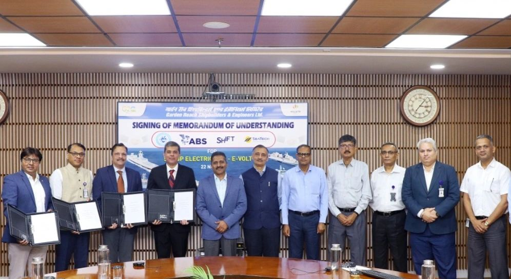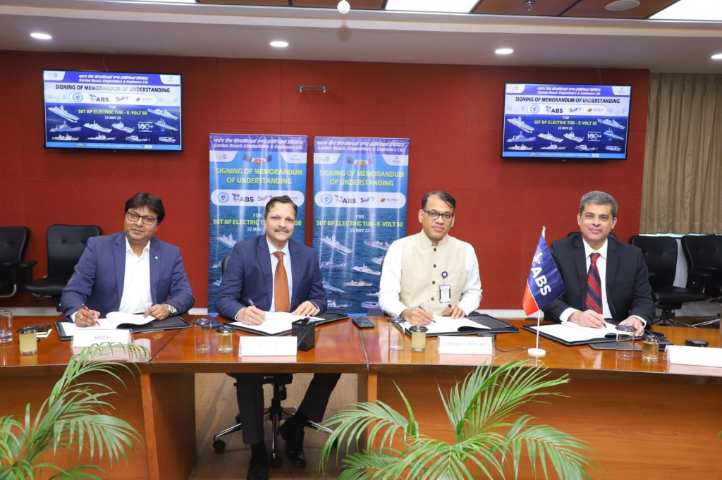 Singapore, November 22, 2023 – In a significant stride towards India’s ambition of becoming a global hub for green shipbuilding by 2030, Garden Reach Shipbuilders and Engineers (GRSE) Ltd, inked a historic Memorandum of Understanding (MOU) on Wednesday with SeaTech Solutions International (SSI), Shift Energy and the American Bureau of Shipping (ABS). The collaboration aims to bring to fruition the country’s first Electric Tug E-VOLT 50, a groundbreaking initiative poised to revolutionize India’s tugboat industry by curbing carbon emissions, enhancing operational efficiency, and establishing new benchmarks for performance and environmental sustainability. GRSE India will build Electric Tug based on the E-VOLT 50 design by SSI.